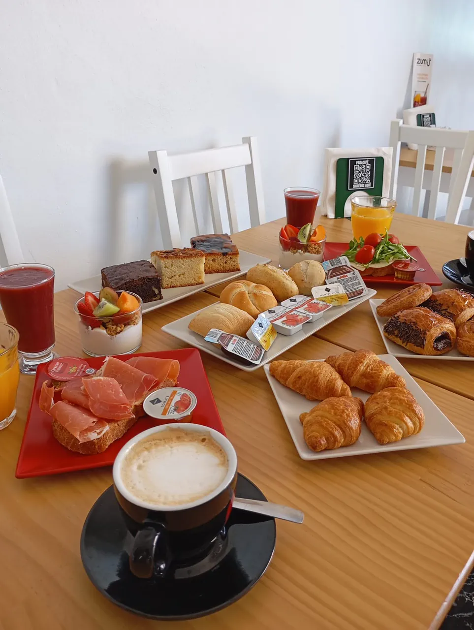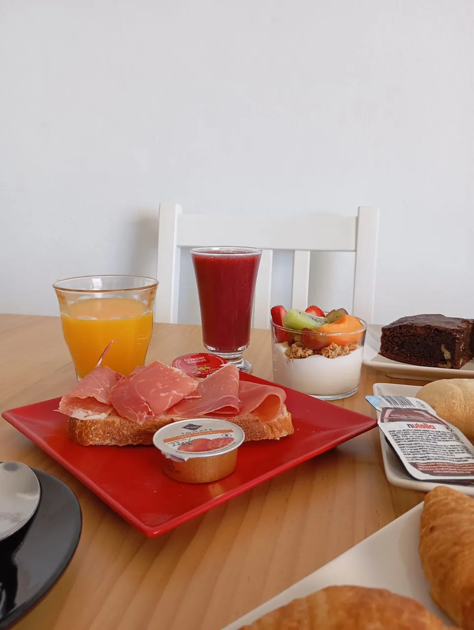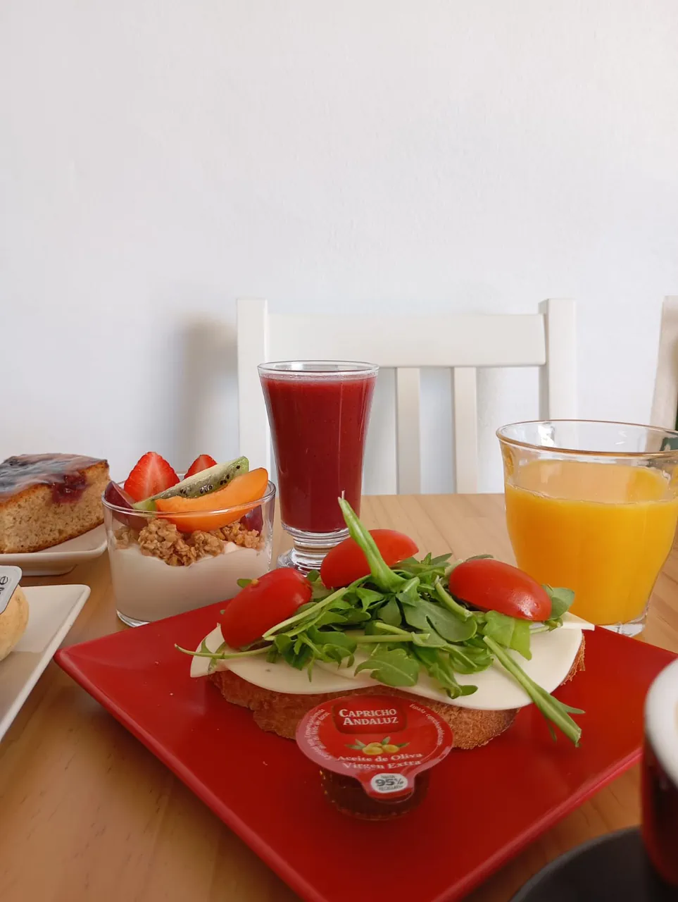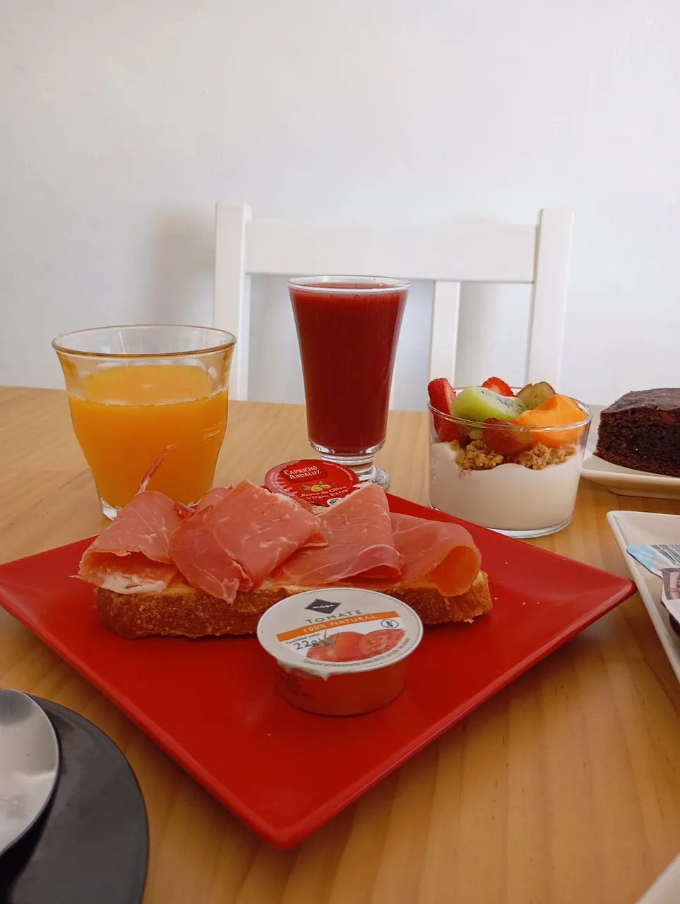 Acompaña con tu tosta favorita — jamón serrano o mozzarella — y añade dos smoothies naturales pequeños. Finaliza con yogur griego, muesli y fruta fresca.