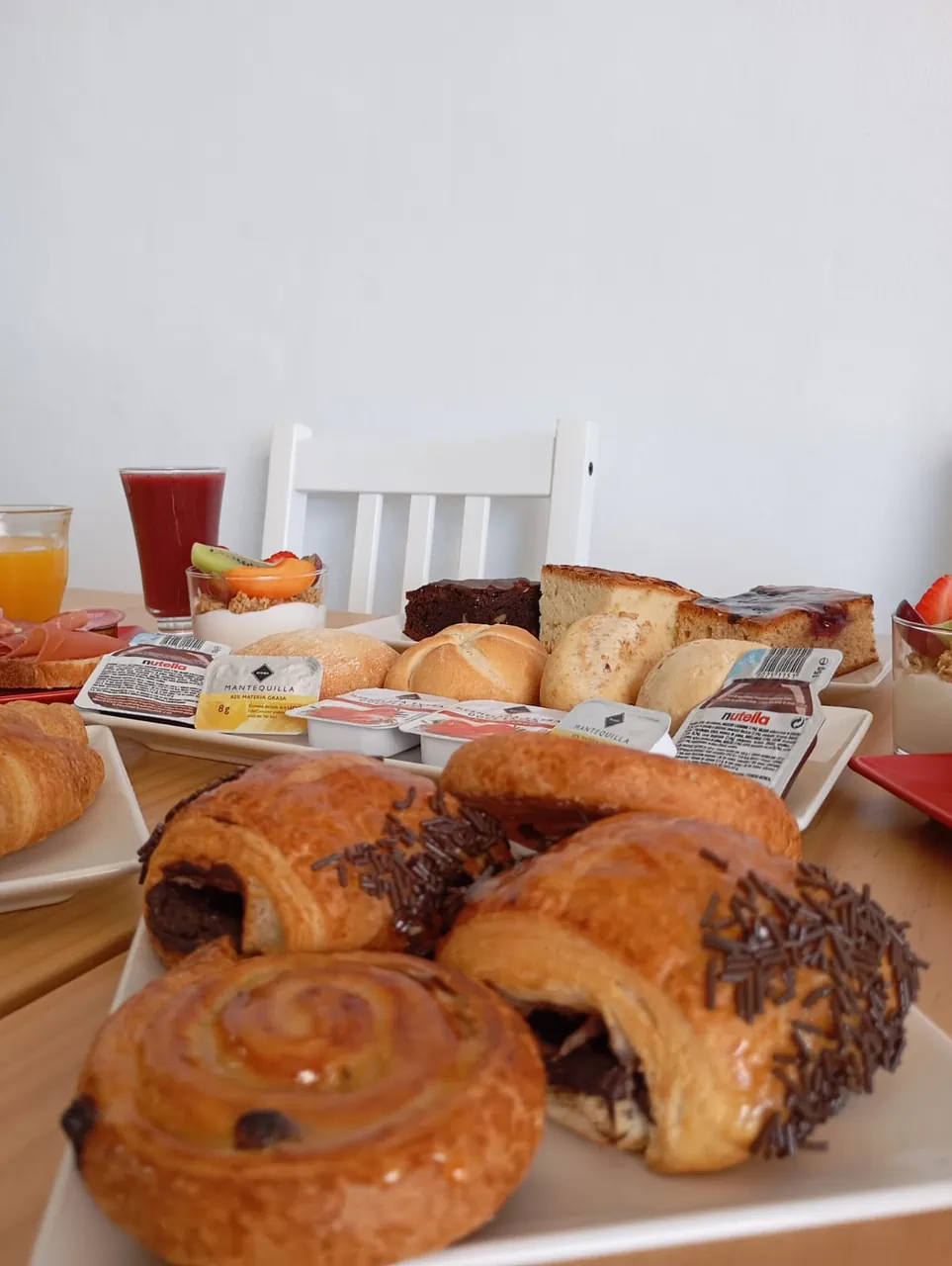 El brunch Deluxe lleva la experiencia un paso más allá. Disfruta de café 100% arábica o té especial, zumo natural de naranja y una selección más amplia de delicias caseras: bizcochos variados, panes y bollería mini con mermelada, mantequilla y Nutella.