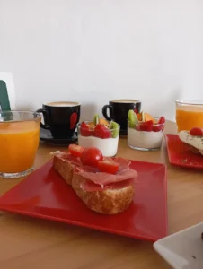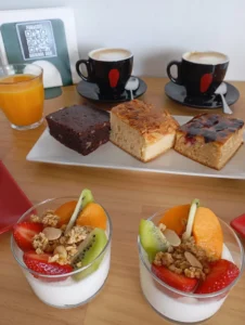 Disfruta de un brunch VIP pensado para saborear sin prisas, ideal para media mañana o mediodía. Incluye café gourmet 100% arábica o té de sabores especiales, zumo natural de naranja y un surtido de bizcochos caseros: sin azúcar, brownie y espelta con frutos rojos.